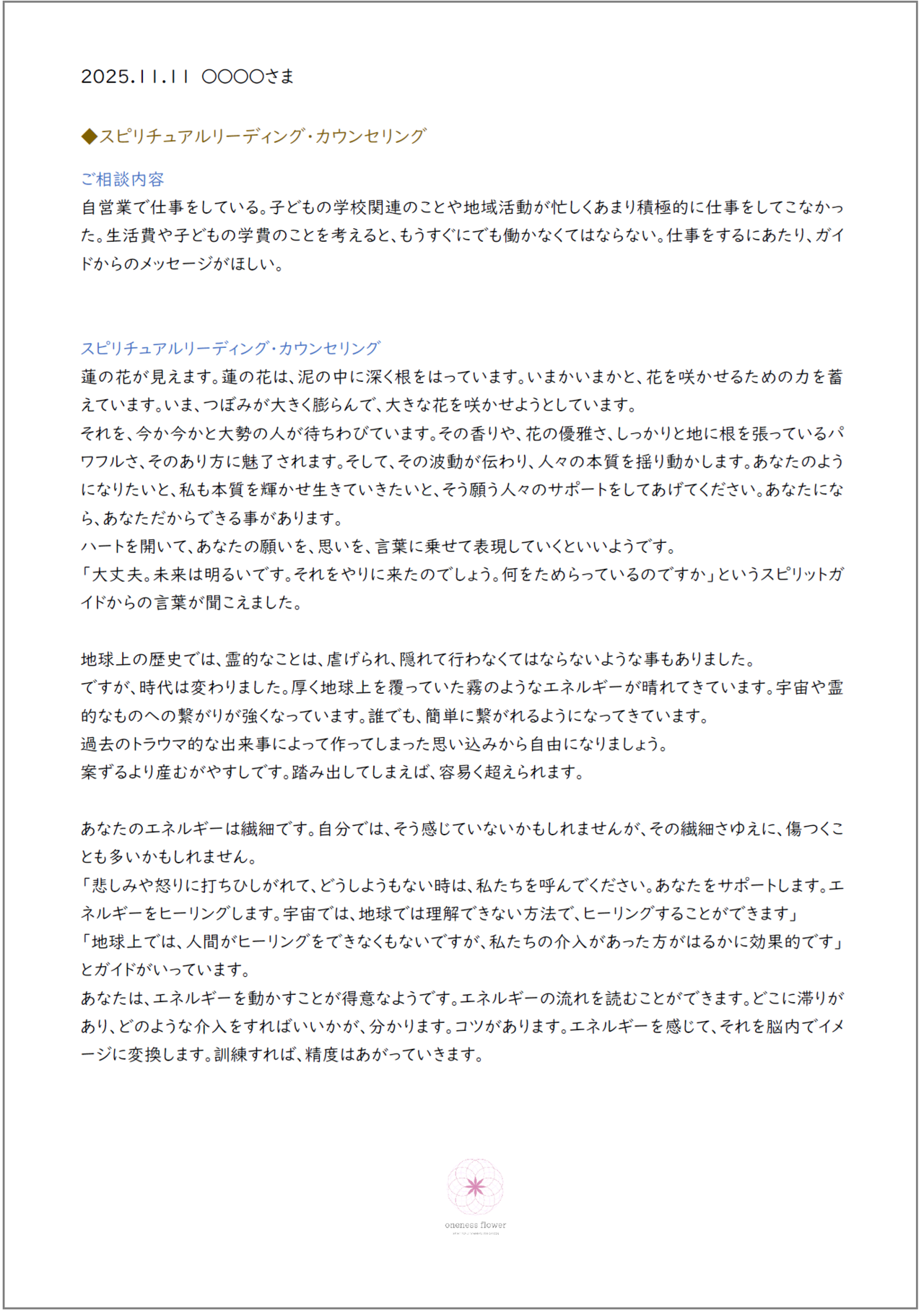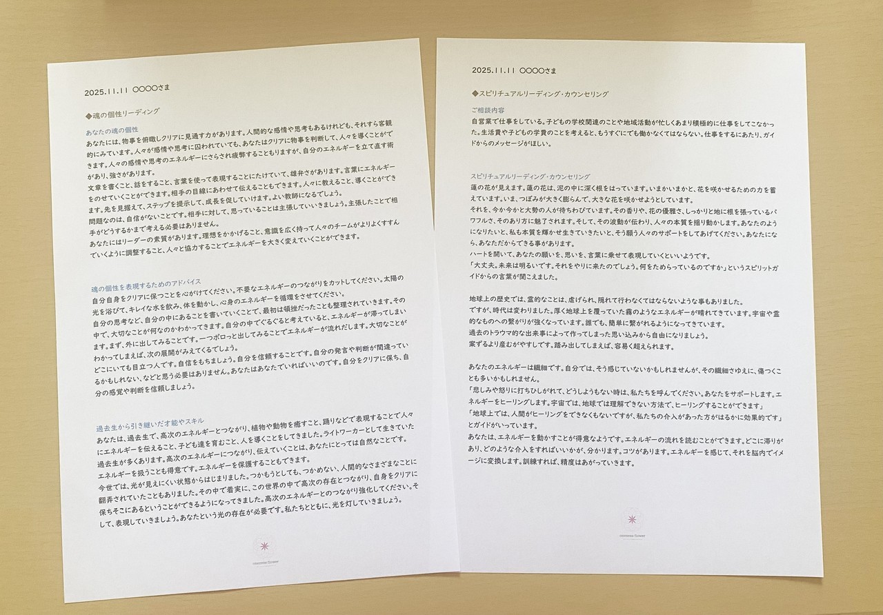 リーディングカウンセリングの内容は、A4用紙1枚程度で書面でお送りいたします。